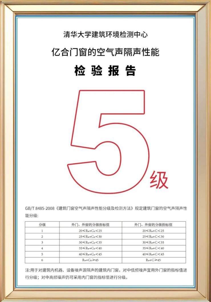 依据GB/T8485-2008《建筑门窗空气声隔声性能分级及检测方法》,清华大学建筑环境检测中心的专家们运用高精尖的测试设备,对亿合门窗的隔音性能进行了全面、深入的检测,评定亿合门窗产品获得40dB隔音性能检测认证,隔音性能分级为5级,代表着产品在隔音、密封等方面的综合性能均达到了高标准水平。