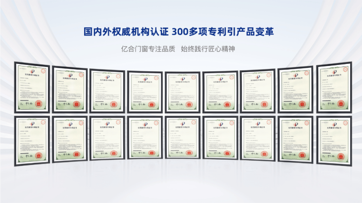 亿合门窗以“肩负亿万家庭合家幸福”为使命,不断向消费者提供更好的产品,打造高颜值、高品质的美好生活家。作为广东省门窗协会会长单位、行业高端全防护门窗的领军品牌,亿合门窗通过对门窗型材、结构、五金等方面的质量、规格、安全性能考量,投入资金展开产品核心技术、现代生产技术等项目研究,目前已累计300余项专利。