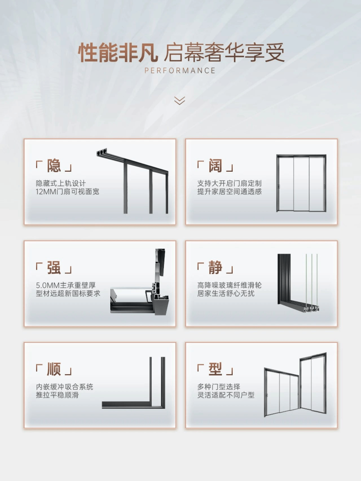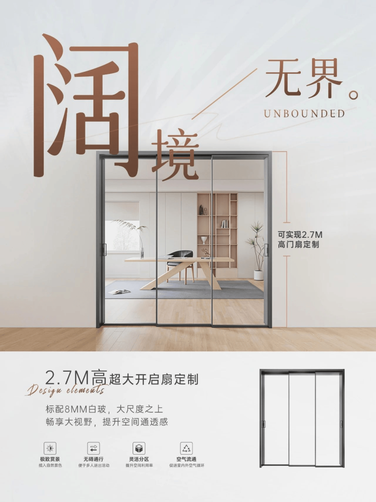 通过一扇推拉门,链接生活的情感和温度,借助高性能设计,让每一次开合都是高品质生活的优雅注脚,启幕美好人居的无限可能。