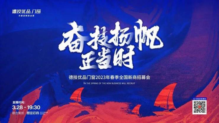 德技优品门窗以「奋技扬帆正当时」为主题开展的2023年春季全国新商招募会即将举行!超值加盟福利政策、年初优惠海量放送!加盟福利只多不少!别犹豫,瞄准3月28日19:30招募会,更多精彩内容敬请关注!