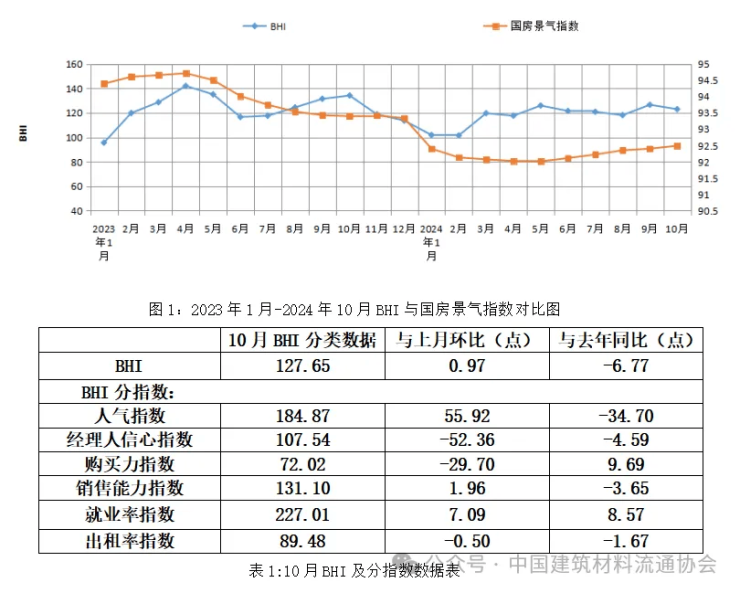 全国建材家居景气指数BHI10月份为127.65,环比上涨0.97点,同比下跌6.77点。全国规模以上建材家居卖场10月销售额为1444.03亿元,环比上涨1.52%,同比下跌2.71%;1-10月累计销售额为12298.95亿元,同比下跌4.62%。中国建材流通协会行业研究部就本期BHI数据解读:10月全国建材家居市场继续延续“金九银十”旺季行情,随着消费品“以旧换新”及一揽子增量政策的进一步显效,建材家居的消费需求进一步被激发,10月BHI微升。具体分析如下: