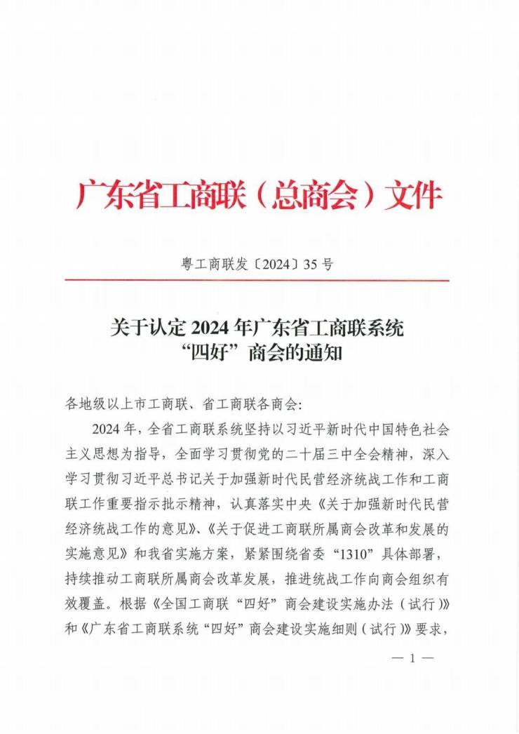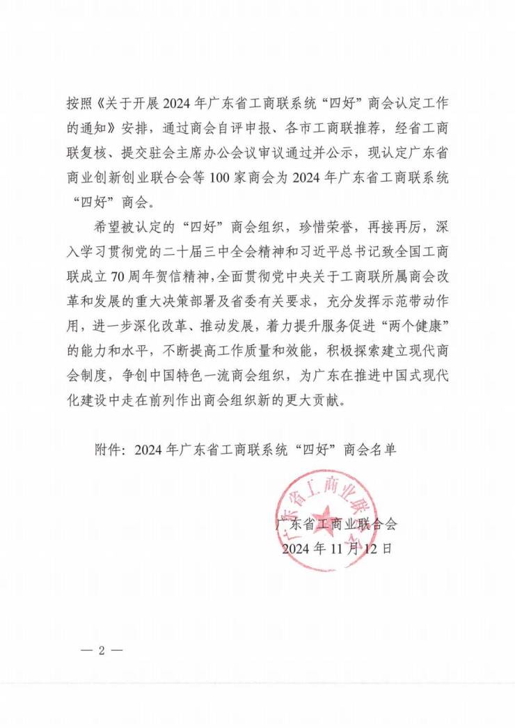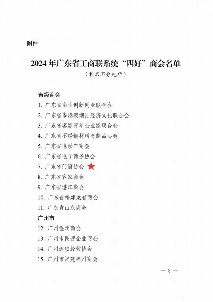 日前,广东省工商联发布《关于认定2024年广东省工商联系统“四好”商会的通知》,正式认定广东省创业创新联合会等100家商会为2024年广东省工商联系统“四好”商会。其中, 广东11家省级商会被认定为2024年广东省“四好”商会,广东省门窗协会荣获2024年广东省“四好”商会称号。