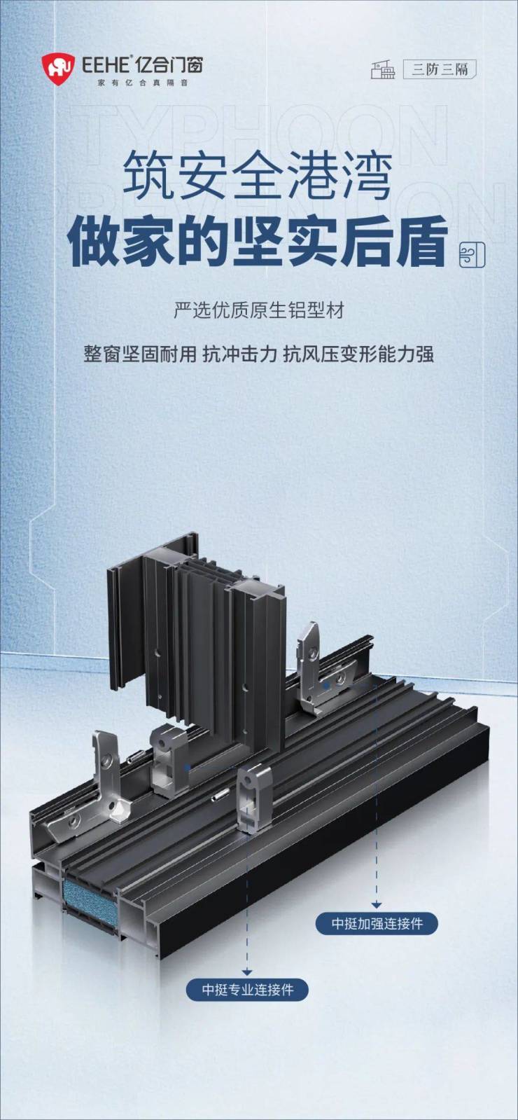 家的第一层,是坚固的守护。从蹒跚学步到步履颠簸,家始终陪伴我们。家之所以给予人们安定感与依赖感,是在于安全的守护和长久的庇护。作为住宅建筑的重要组成部分,门窗不仅仅是居室与外界联系的主要通道,更是应对外界严峻环境的第一道屏障。亿合门窗采用航空级原生铝型材,硬度高、韧性较好、抗腐蚀性较强,且更结实更耐用,搭配加强中梃设计和注胶角码工艺,将型材牢牢锁住,实现无缝密封;在寒风来袭时,无论室外有多大风雨,门窗依旧稳固挺立。