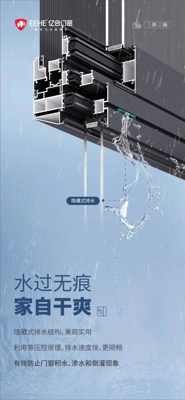 市面上许多门窗在雨季来临时遇到高风压都会形成一定的雨水倒灌,从而使窗户内积水排通不畅,引起铝材发霉发臭、严重的可能还会导致雨水渗入室内,影响装修美观,造成居住困扰之余还有可能引起细菌疾病。因此,门窗的排水设计是防止门窗渗水的重要环节。亿合门窗采用隐藏式排水结构,更具美观与实用,以垂直向下的设计,避免了风直吹排水孔,加之排水动力更足,不会形成积水与雨水倒灌现象,哪怕在面对暴雨袭击时,也能做到“滴水不渗”,让生活省心更安心。