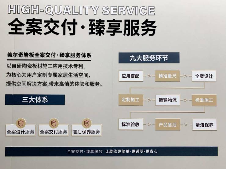 为了解决交付时间长、加工难、运输难、标准不统一等问题,打通岩板落地交付全链条,美尔奇推出了“全案交付 臻享服务”体系。该体系以自研陶瓷板材施工应用技术专利为核心,通过标准化、一体化管理,为消费者提供岩板选材、设计、物流、加工、铺贴、辅材、售后等一站式交付服务,让用户感受便捷舒适的家居定制体验。